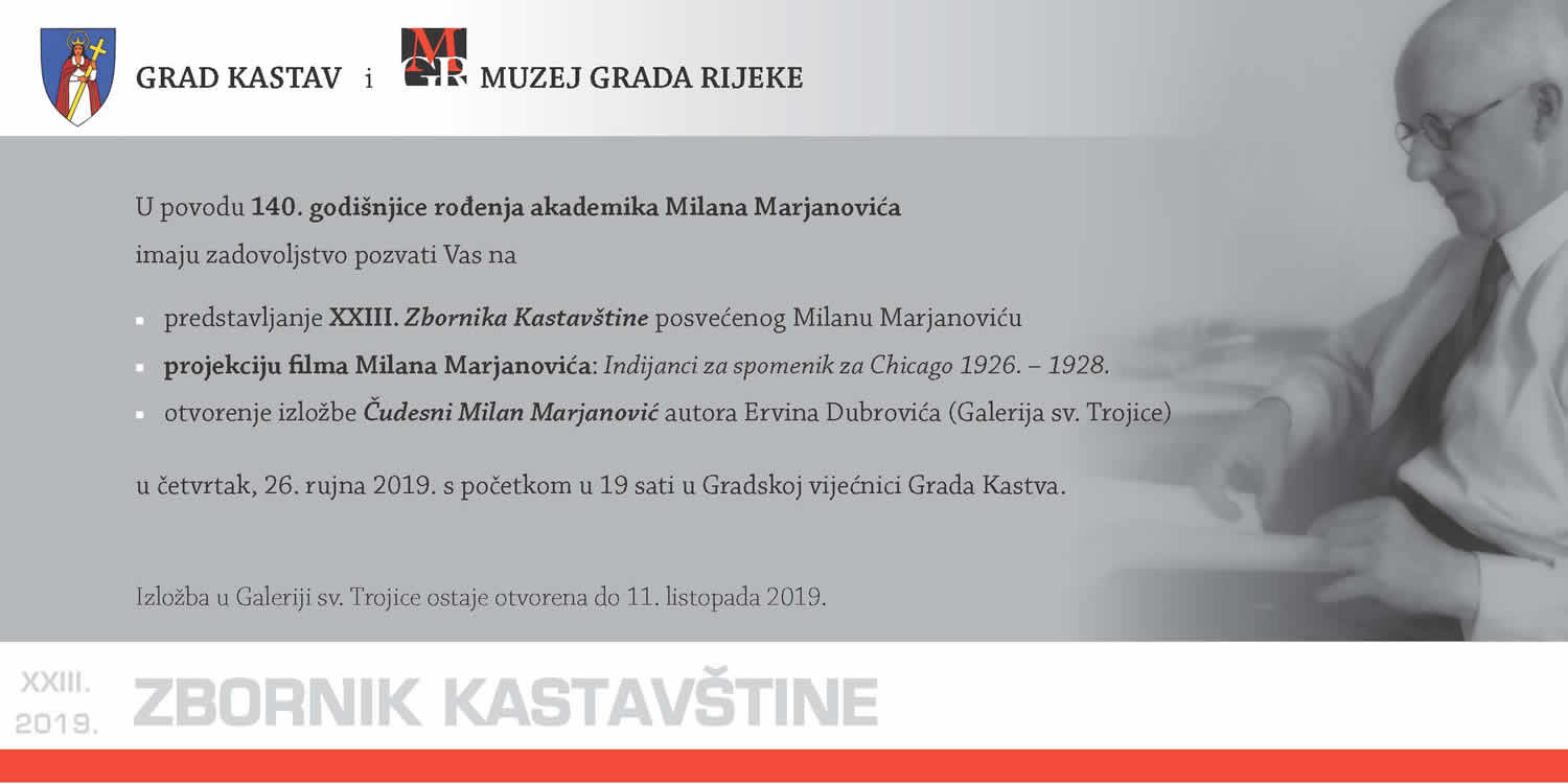 Grad Kastav i Muzej Grada Rijeke u povodu 140. godišnjice rođenja akademika Milana Marjanovića imaju zadovoljstvo pozvati Vas na predstavljanje XXIII. Zbornika Kastavštine posvećene Milanu Marjanoviću.